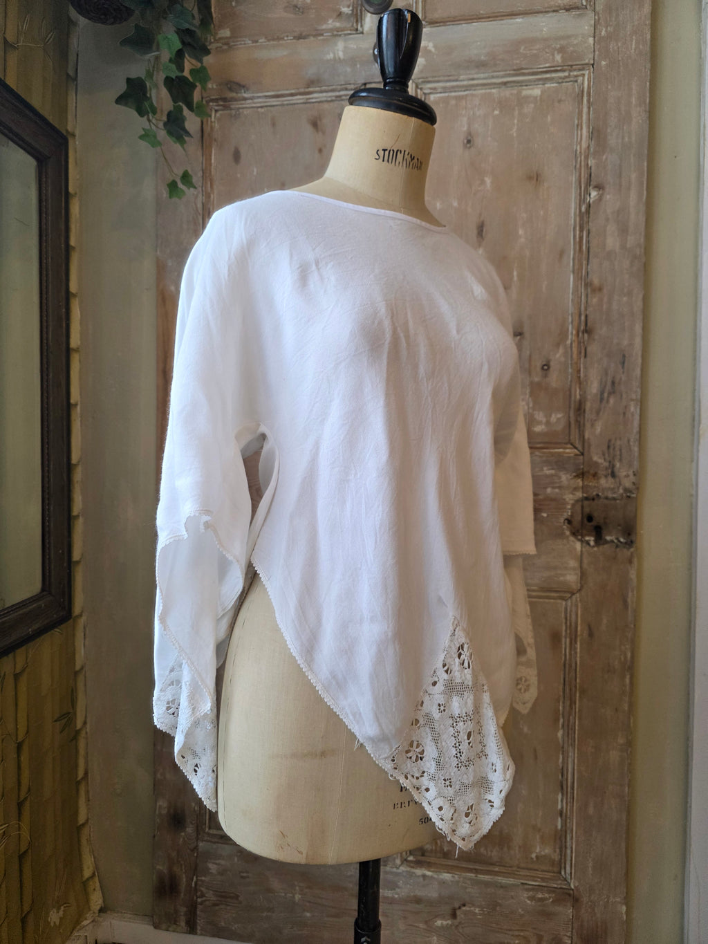 Vintage Upcycled Linen Fairy Top – Handmade Boho Blouse, Open Size, Lace Detail